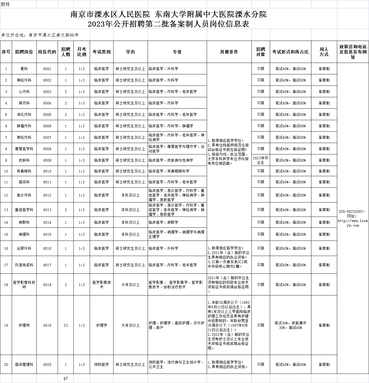 本次招聘的相关信息在南京市溧水区人民政府网(http://www.njls.gov.cn)和南京市溧水区人民医院官网(http://www.lsrmyy.com)发布。具体的招聘单位、岗位、数量、资格条件详见《南京市溧水区人民医院 东南大学附属中大医院溧水分院2023年公开招聘第二批备案制人员岗位信息表》(以下简称《岗位信息表》)。