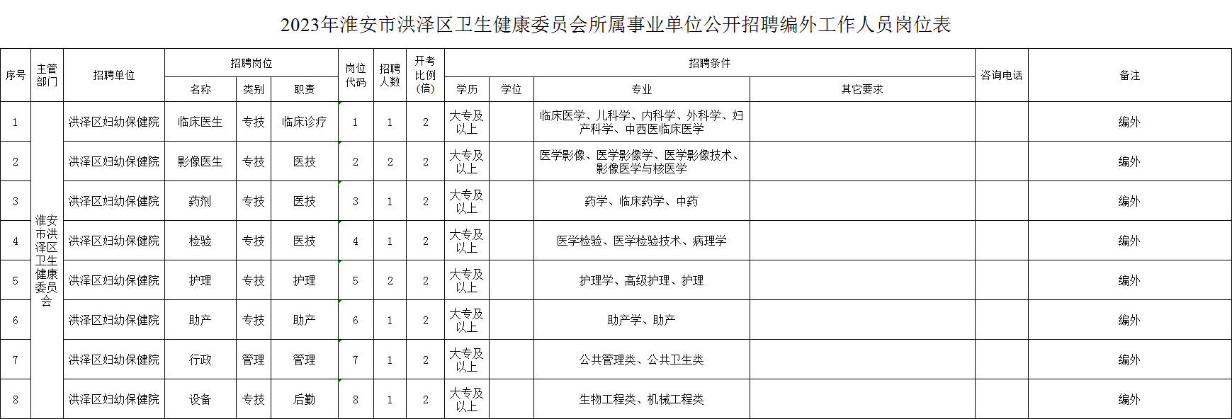 招聘单位、岗位、人数和相关要求详见《2023年淮安市洪泽区卫生健康委员会所属事业单位公开招聘编外工作人员岗位表》(以下简称《岗位表》,见附件1)。