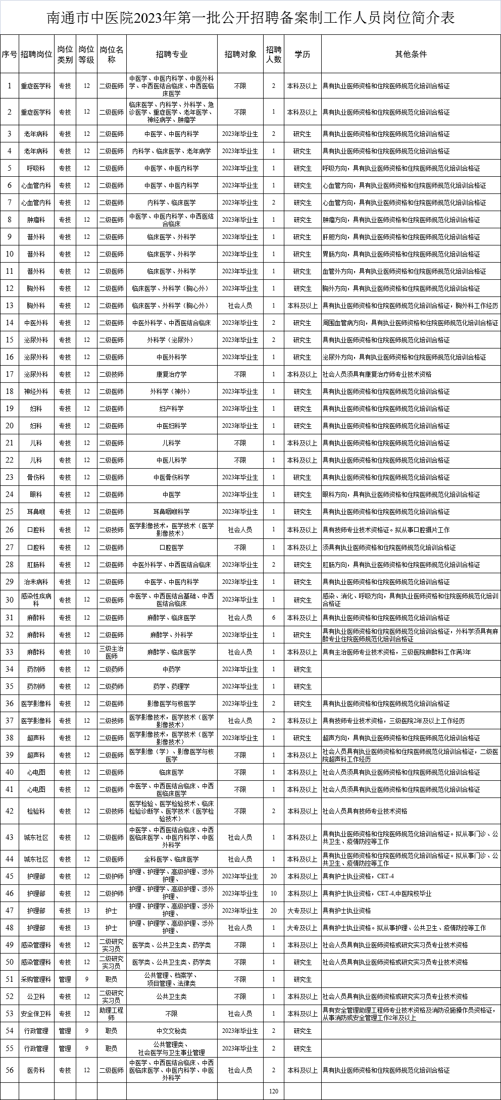 具体岗位及各岗位招聘条件等详见附件:《南通市中医院2023年上半年公开招聘备案制工作人员岗位简介表》(以下简称:《岗位简介表》)。《岗位简介表》可在南通市中医院网站(http://www.ntzyy.com/news/6/)查询。