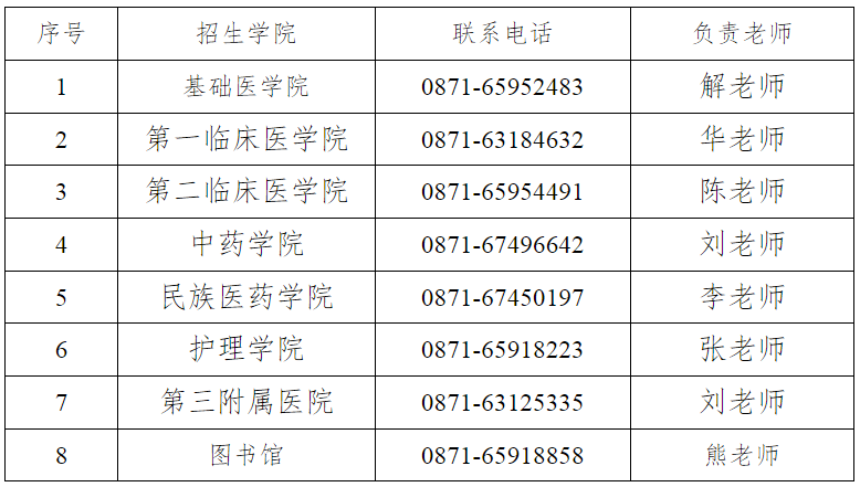 1.云南中医药大学研究生处招生办公室电话:0871-65918241
