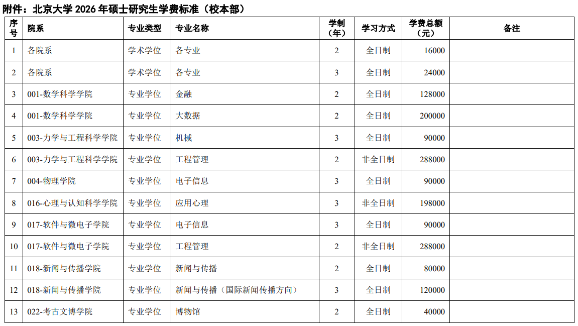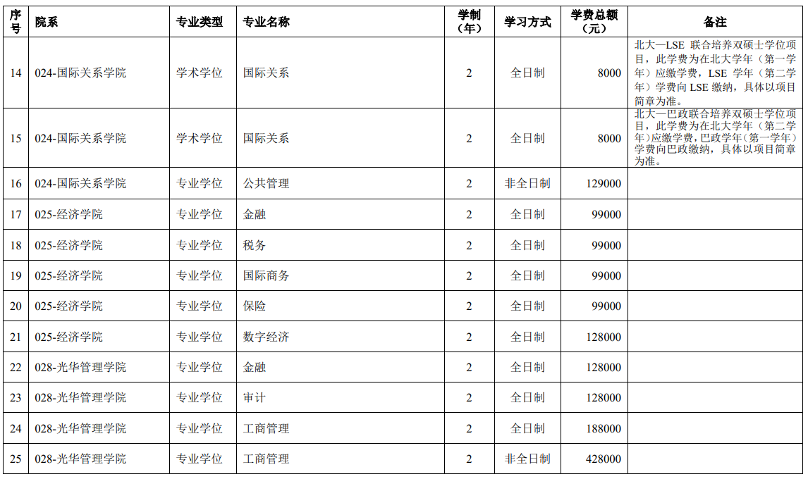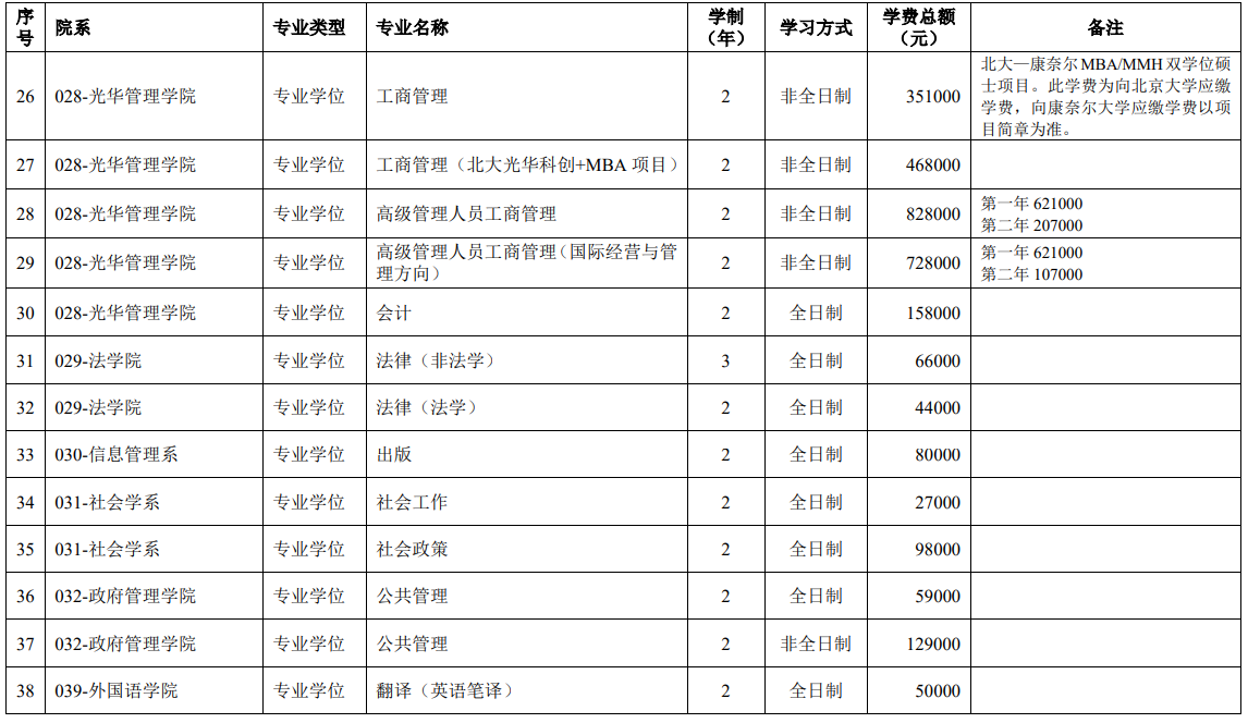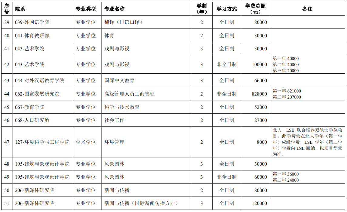 说明:金额币种为人民币。除备注中有明确说明的专业外,其他专业每生每学年学费标准为学费总额除以学制。总额为“待定”的专业学费标准以上级批复为准。