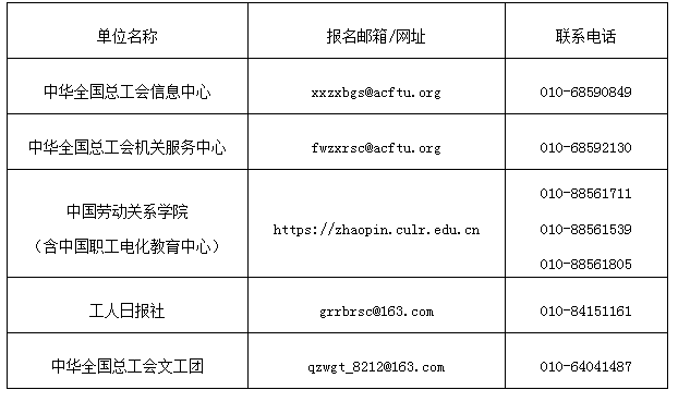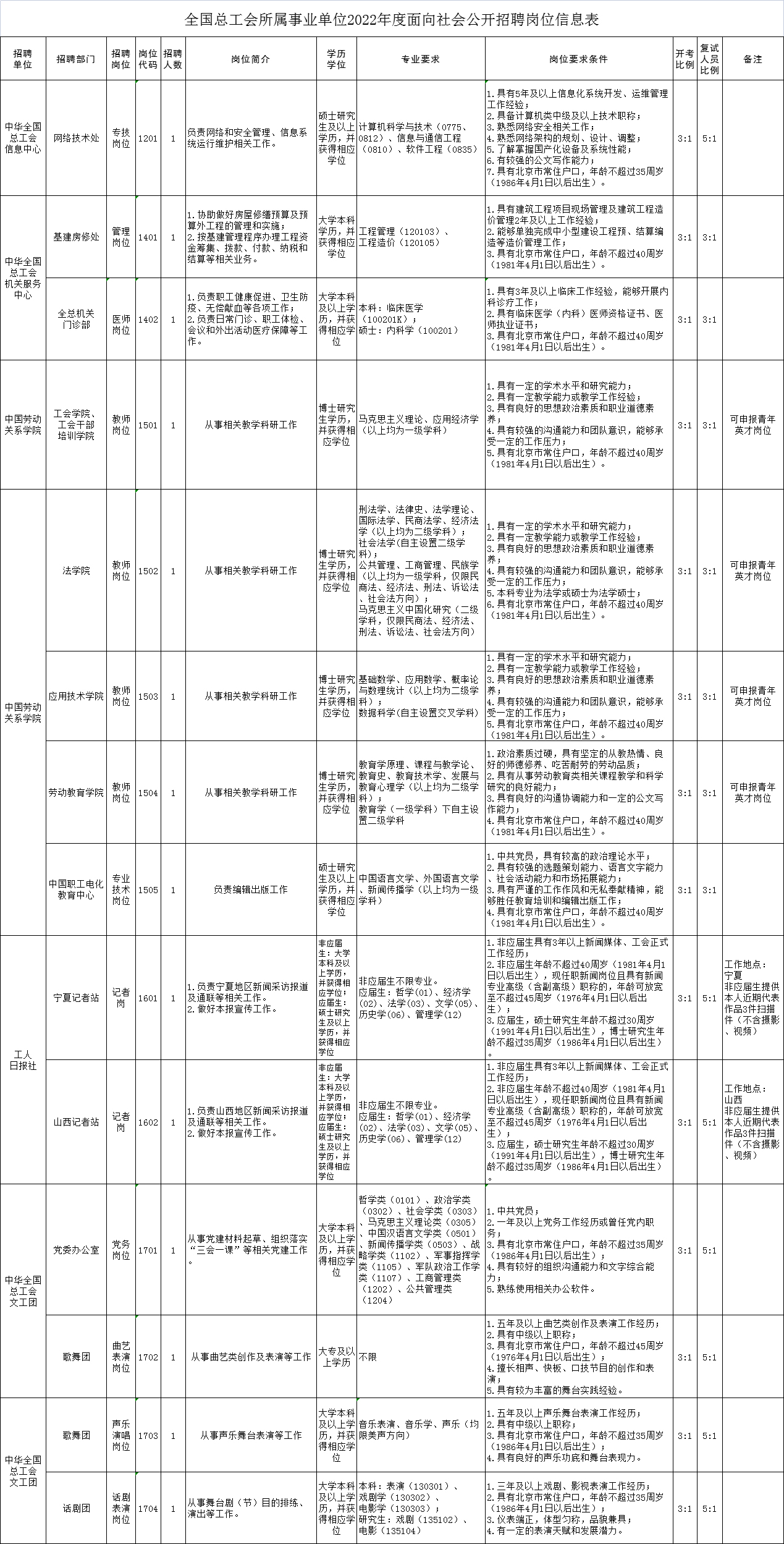 根据工作需要,按照《事业单位人事管理条例》和事业单位公开招聘工作有关政策规定,全国总工会所属事业单位2022年度面向社会公开招聘工作人员14名。现将有关事项公告如下。 一、招聘单位基本情况 中华全国总工会信息中心是中华全国总工会直属的全额拨款事业单位,主要职责是工会信息系统建设,工会系统信息收集分析,机关办公自动化和计算机等相关设备的管理和维护等工作。 中华全国总工会机关服务中心是中华全国总工会机关直属的全额拨款事业单位,其主要职责是负责机关后勤管理、保障和服务工作。 中国劳动关系学院是中华全国总工会直属的唯一一所普通高等学校,由中华全国总工会与教育部共建。经过70几年的发展,学校正逐步形成以普通本科教育、工会干部教育培训为根本,聚焦中国特色劳动关系和工会领域重大理论和实践问题研究,推进普通学历教育、劳模和工匠教育、特色职工教育、港澳工运人才教育协调发展的办学格局,成为在工会和劳动关系领域学科门类最齐全、最完整的大学。 中国职工电化教育中心筹建于1983年,1986年7月正式组建成立,是经中编办批准成立的事业单位。2004年经全总党组、书记处同意,中国劳动关系学院与中国职工电化教育中心实行资产重组。重组后,中国职工电化教育中心作为学院下属的独立法人单位,独立开展业务活动。中心成立多年来,秉承着服务全总、服务全国职工的理念,在职工教育、职工文化传播领域发挥着不可替代的作用 工人日报社是中华全国总工会直属事业单位。《工人日报》是一张融政治、经济、文化、社会生活于一体的全国性综合大报。工人日报社记者站是报社直属机构,负责所在省(区、市)新闻宣传报道及相关工作。 中华全国总工会文工团是中华全国总工会直属的公益二类事业单位,也是全国工会系统唯一的国家级综合性专业文艺团体。主要职责是围绕党和国家工作大局以及工会工作的主要任务,用文艺的形式宣传党的路线方针政策,弘扬劳模精神、劳动精神和工匠精神,团结动员广大职工群众听党话、跟党走,积极为国家建设做出贡献。 二、应聘人员基本条件 (一)具有中华人民共和国国籍。 (二)拥护中华人民共和国宪法和法律法规,拥护中国共产党领导和社会主义制度,品行端正,遵纪守法。 (三)热爱党的工运事业,工作态度积极,事业心、责任感强,具有良好的协作精神和服务意识。 (四)具备岗位所需的专业或者技能条件。 (五)具有正常履行职责的身体条件和心理素质。 (六)具备岗位所需的其他条件。 因犯罪受过刑事处罚的人员、被开除中国共产党党籍的人员、被开除公职的人员、被依法列为失信联合惩戒对象的人员,在各级公职人员招考中被认定有舞弊等严重违反考试录(聘)用纪律行为的人员,以及法律法规规定不得聘用为事业单位工作人员的其他情形的人员,不得报名应聘。 报名应聘人员不得报考聘用后构成回避关系的招考岗位。 三、招聘岗位及资格条件 此次招聘涉及14个岗位、计划招聘14人,具体岗位条件详见附件1岗位信息表。其中,有关岗位专业条件参考教育部公布的专业目录(《普通高等学校本科专业目录》和《授予博士、硕士学位和培养研究生的学科、专业目录》)。报名应聘人员在报名时对专业有任何疑问的,可以直接拨打报名咨询电话进行咨询了解。 四、招聘程序 (一)报名方式和时间。 应聘人员登录指定系统报名或填写公开招聘报名表和信息登记表,附个人证件照及学历、学位证书、身份证、相关证明材料等扫描件发送至指定邮箱(邮件标题格式为:应聘岗位名称+岗位代码+姓名+院校+专业+学历)。报名时间自公告之日起至2022年4月29日17:00截止。 其中,工人日报社岗位应聘人员,尚未取得证书的应届毕业生,提供所在学校出具的在读证明和应届毕业生就业推荐表;非应届生提供本人近期代表作品3件电子扫描件(不含摄影、视频)。 (二)资格审查。 资格审查工作由招考单位负责,贯穿公开招聘全过程。根据本公告规定的报名资格条件和招聘岗位要求,对报名申请进行审查,做到客观、公正、及时,对所有报名应聘人员一视同仁。同一岗位通过资格审查的人数与该岗位计划招聘数的比例至少达到3:1方可开考,达不到该比例的,在笔试开考前应当减少该岗位招聘人数以确保达到开考比例,直至取消该岗位招聘计划。取消岗位招聘计划的,该岗位报名应聘人员可在笔试开始前改报符合报名资格条件的其他岗位。减少岗位招聘人数或者取消岗位招聘计划将于笔试前在全国总工会官网(www.acftu.org)公布。 (三)初试。 中国劳动关系学院教师岗位(岗位代码:1501-1504)采用试讲方式,其他单位岗位采用笔试方式。由全国总工会组织部和有关招考单位组织实施,具体时间、地点和有关事项另行通知。 (四)复试。 根据初试成绩由高到低的顺序,按规定比例(各岗位规定比例见附件1岗位信息表)确定参加复试人员名单(初试成绩并列的,一并进入复试)。具体时间、地点和有关事项将由招考单位另行通知。如有人员放弃,根据初试成绩由高到低的顺序确定递补人员名单。同一岗位确认参加复试人员少于3人的,则中止该岗位的招聘。 复试前,各招考单位对报名应聘人员进行资格复审,根据报名申请与应聘人员本人及其身份证件(身份证、学生证、工作证等)原件、所在学校或者单