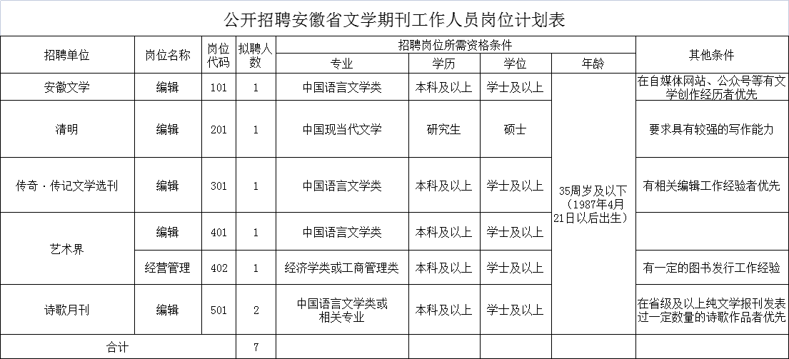 本次招聘岗位共7名,详见《公开招聘安徽省文学期刊工作人员岗位计划表》(附件1)。