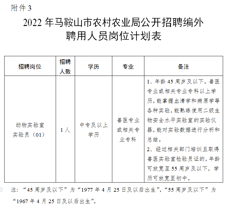 因工作需要,马鞍山市市农业农村局下属事业单位畜牧兽医技术服务中心向社会公开招聘编外聘用制动物实验室实验员1名。