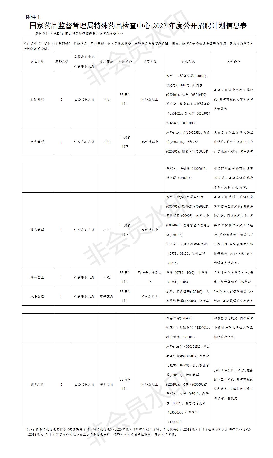 本次招聘编制内人员8人,具体岗位及资格条件详见《国家药品监督管理局特殊药品检查中心2022年公开招聘工作信息表》。