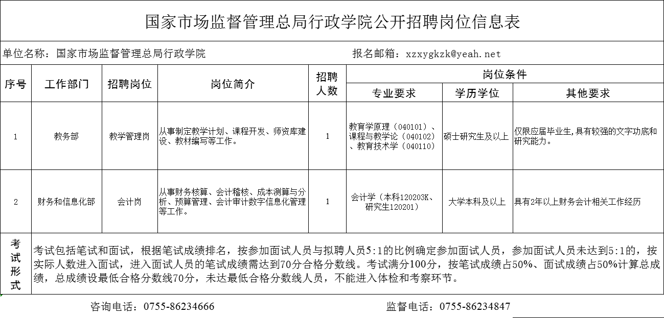 2.考试。详见《国家市场监督管理总局行政学院公开招聘岗位信息表》(附件1)。