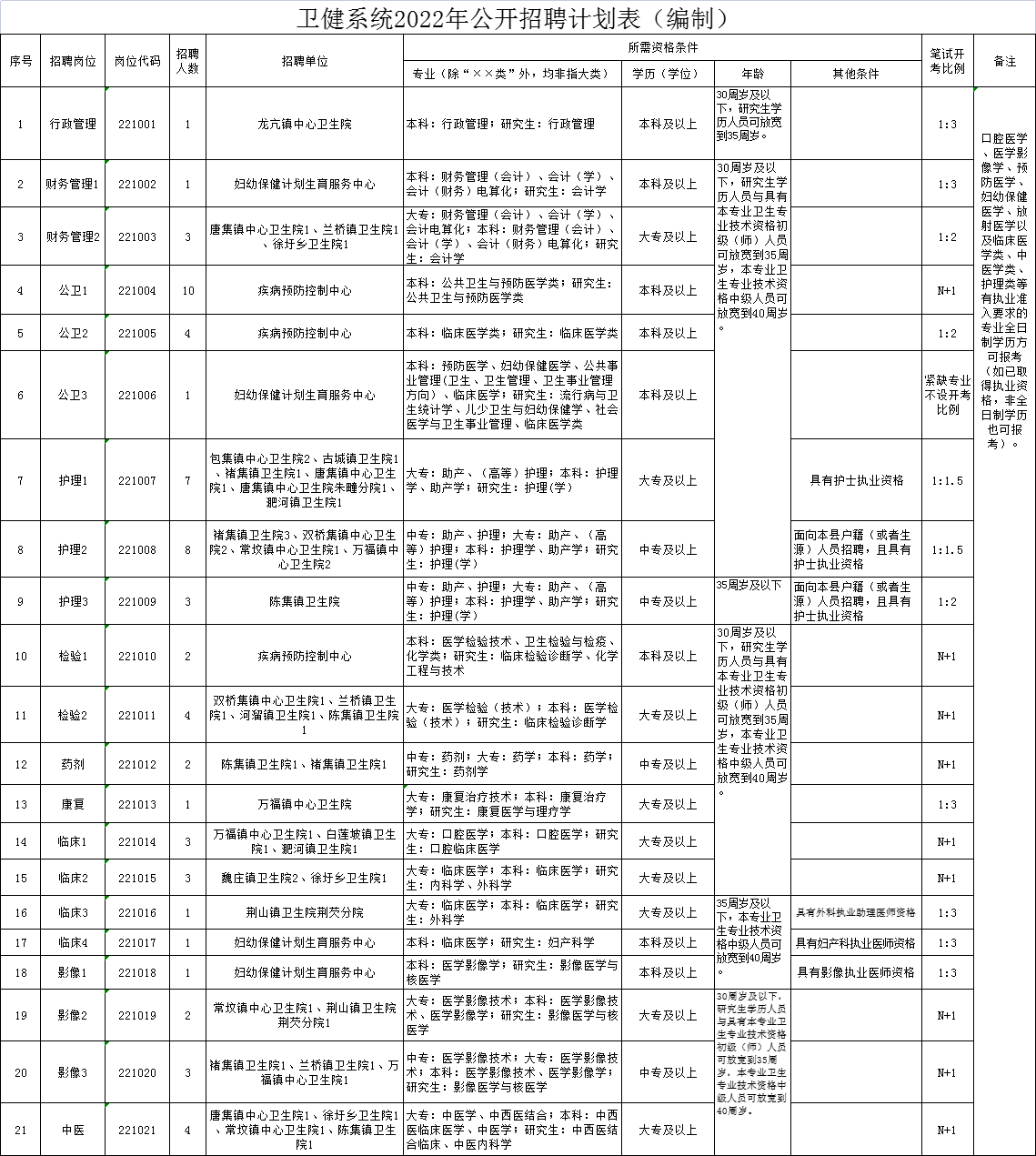 4.岗位取消、核减和改报。根据各岗位招聘计划数设定笔试开考比例(开考比例详见《岗位表》,开考比例为N+1的,N为招聘计划数;招聘数为1的紧缺岗位与招聘中高级专业技术人才的岗位不设开考比例),报考同一岗位的报考人员,确认报考人数与岗位招聘计划数的比例达到规定比例方可开考,未达到开考比例的,相应减少或取消该岗位招录计划数(减少招录计划数的岗位开考比例不变)。若有减少或取消岗位计划情况,将于2022年6月15日发布公示。