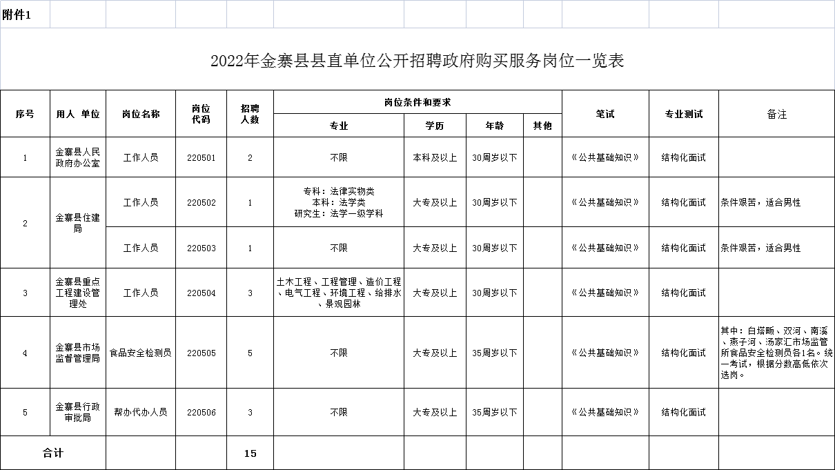 我县部分县直单位2022年计划招聘15名政府购买服务岗位工作人员(具体计划见附件岗位表)。