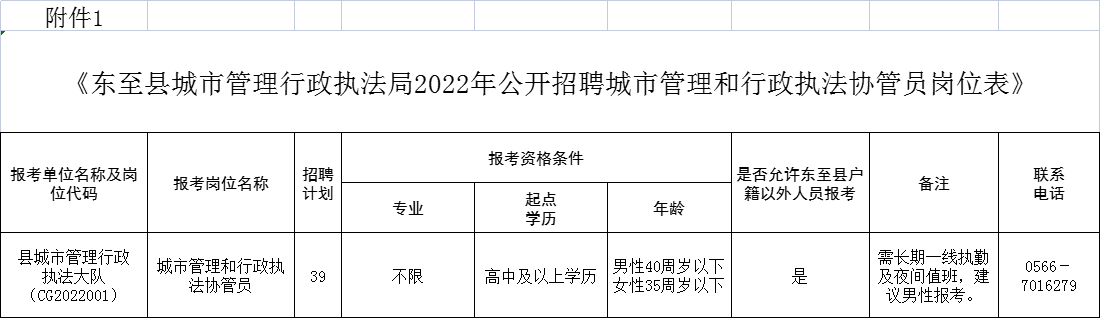 附件:1.《东至县城市管理行政执法局2022年公开招聘城市管理和行政执法协管员岗位表》