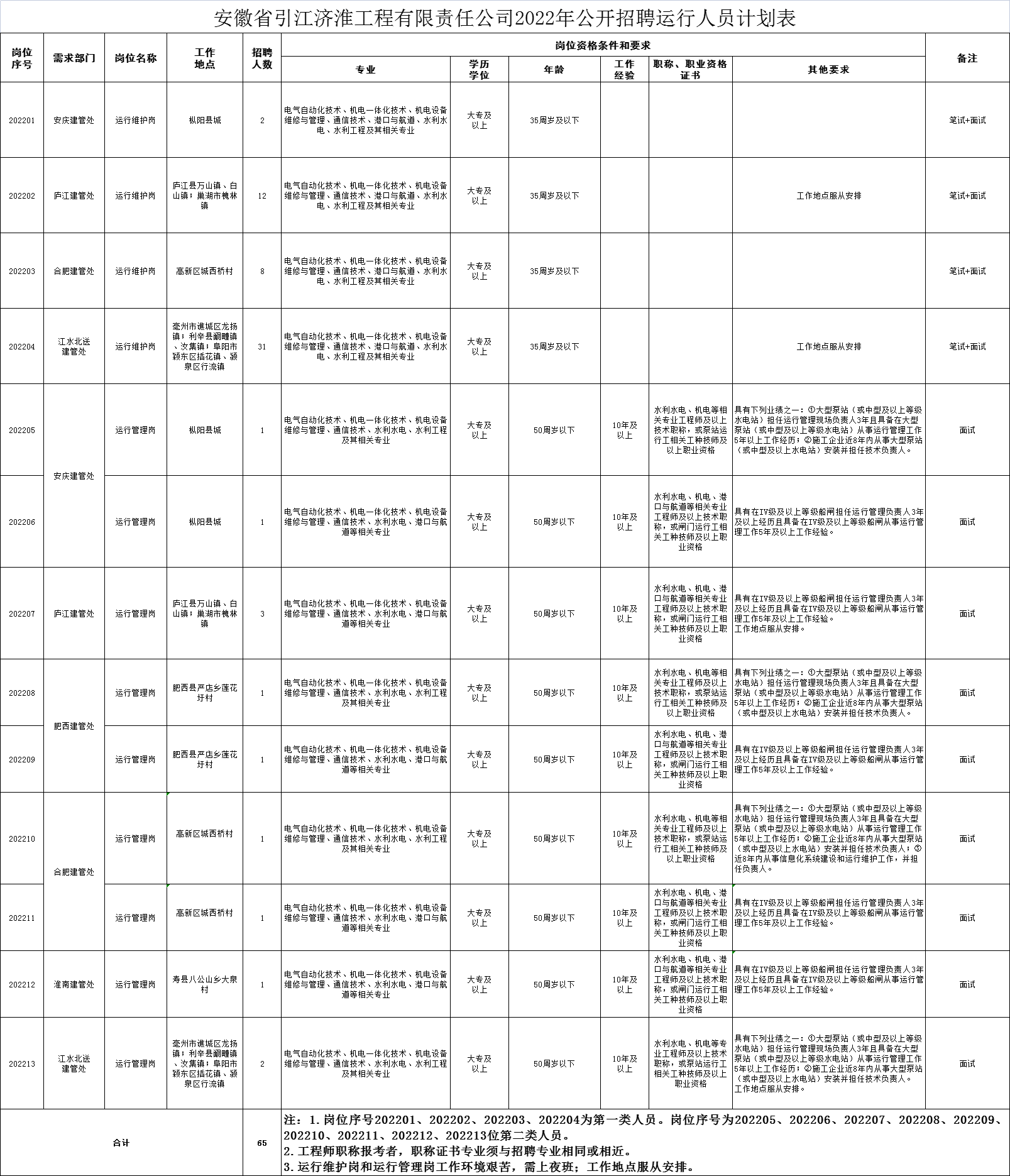 结合岗位要求以及工作实际,本次招聘岗位分为两类,第一类人员(运行维护人员53名)、第二类人员(运行管理人员12名),各岗位编号及具体岗位要求详见附件《安徽省引江济淮工程有限责任公司2022年公开招聘运行人员计划表》。