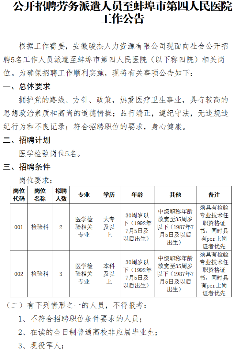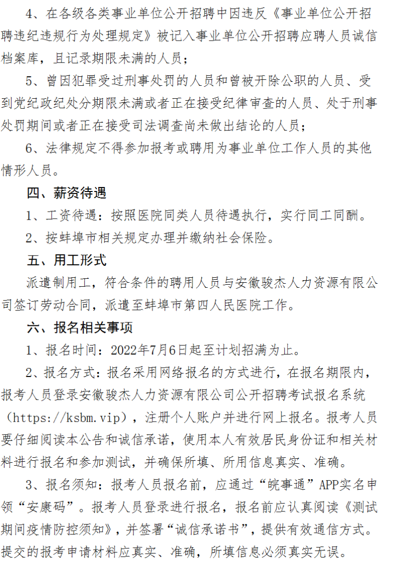 2022年公开招聘劳务派遣人员至蚌埠市第四人民医院工作公告