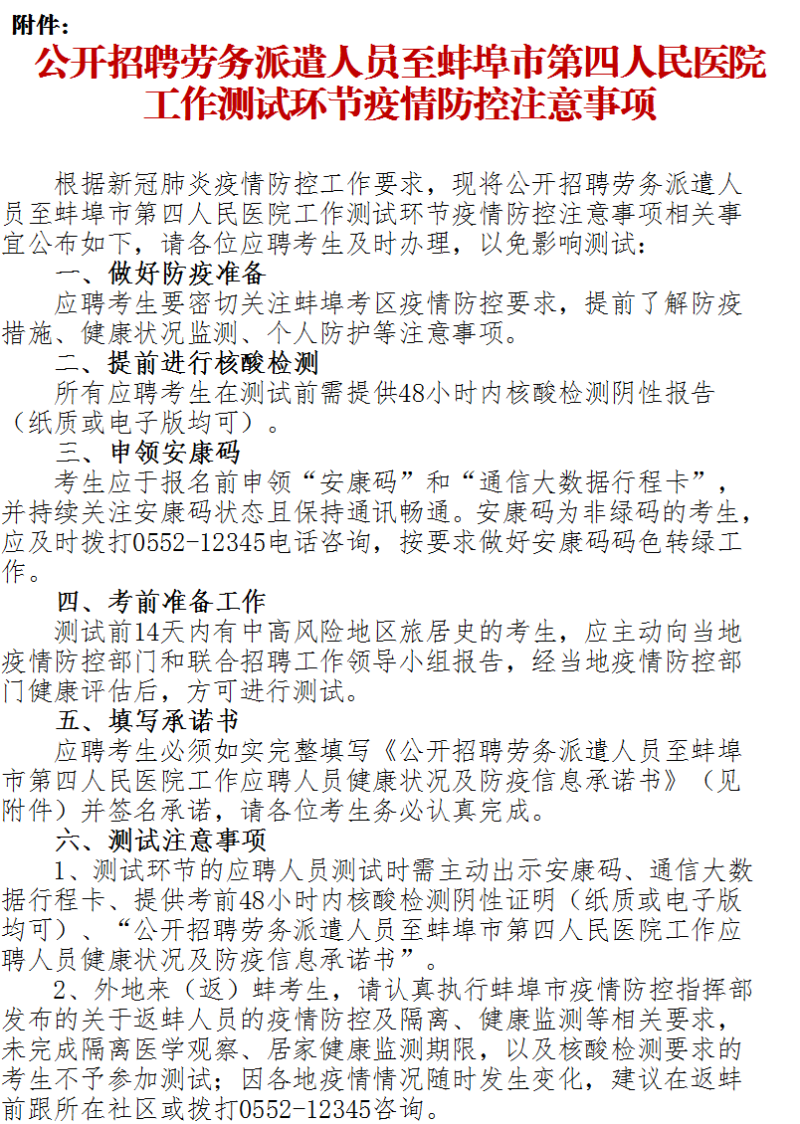 附件:公开招聘劳务派遣人员至蚌埠市第四人民医院工作应聘人员健康承诺书.docx
