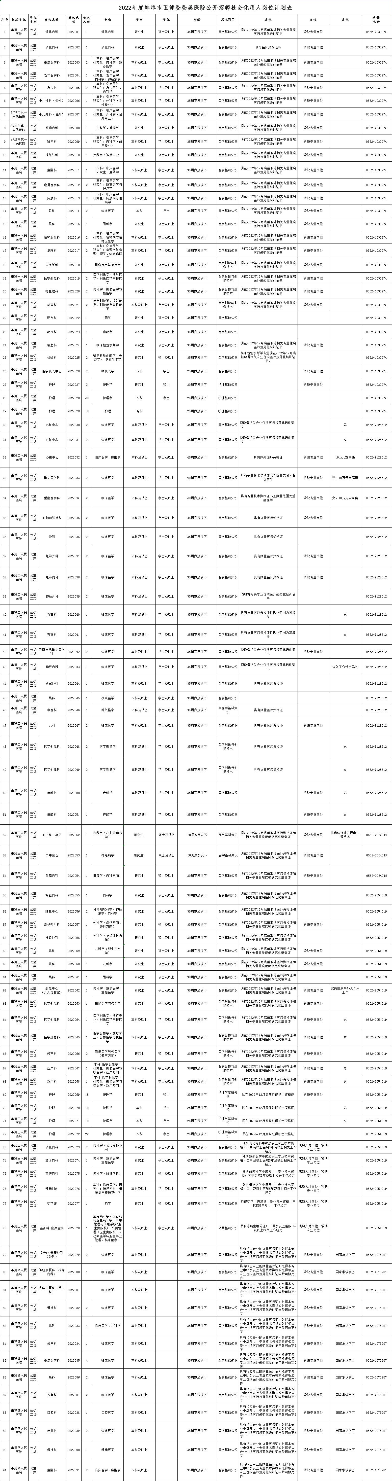 1.考试科目:详见《2022年度蚌埠市卫健委委属医院公开招聘社会化用人岗位计划表》,满分为100分。