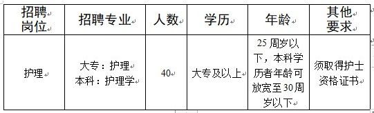 医院近期拟招聘一批合同制护理人员,根据工作需要,本次暂从报考人员中录用40人。如一年内护理岗位出现空缺,将在未录取人员中,按照考试成绩排序,经体检考察合格后,择优进行补录。