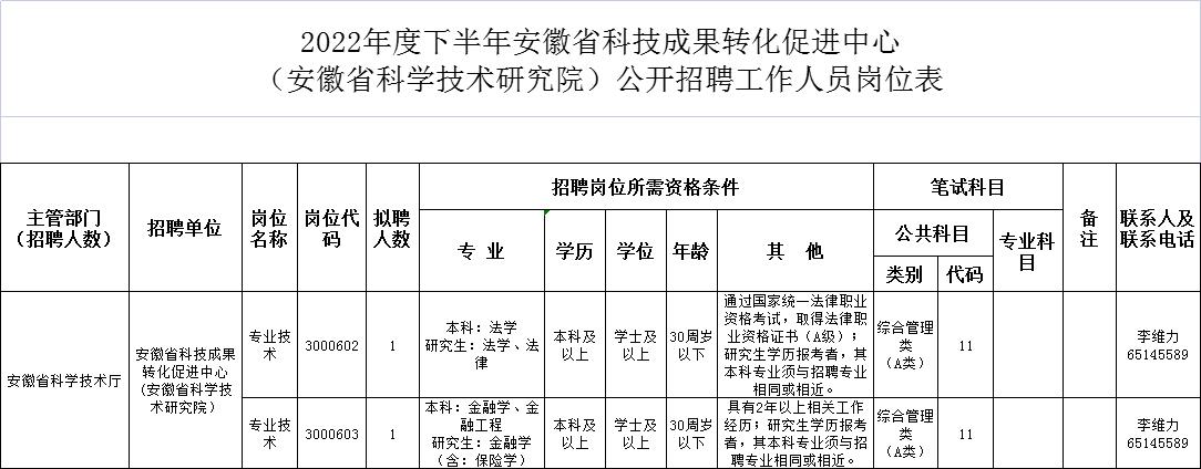 经核准,2022年度下半年安徽省科技成果转化促进中心(安徽省科学技术研究院)公开招聘工作人员2名,招聘计划(岗位)等信息见附件。