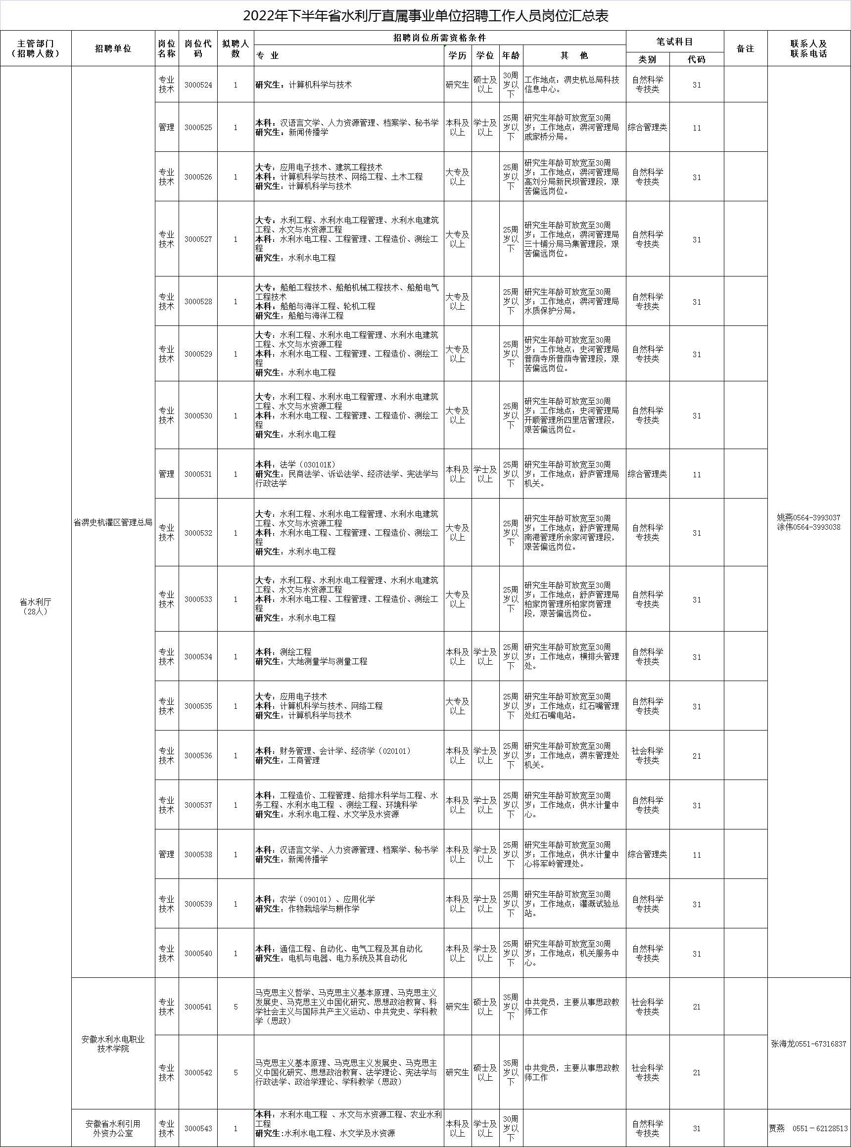 根据《事业单位人事管理条例》(国务院令第652号)和中共安徽省委组织部、安徽省人力资源社会保障厅《关于印发〈安徽省事业单位公开招聘人员暂行办法〉的通知》(皖人社发〔2010〕78号)规定和要求,现就省水利厅直属事业单位2022年下半年公开招聘工作人员有关工作公告如下。