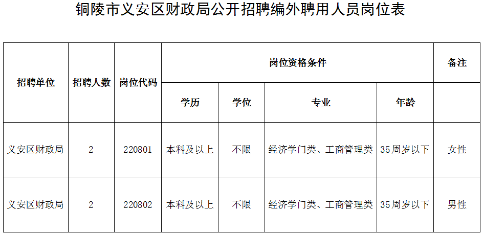 招聘岗位及资格条件详见《铜陵市义安区财政局公开招聘编外聘用人员岗位表》(附后)。