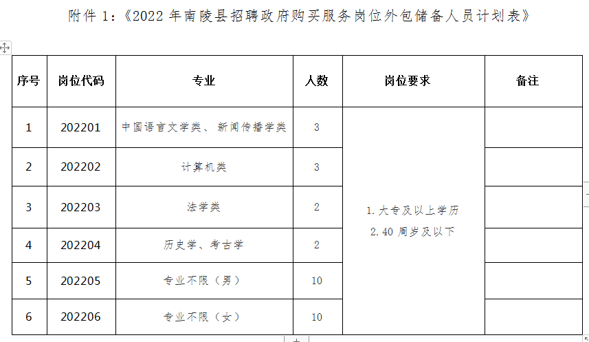 本次面向全社会公开招聘政府购买服务岗位储备工作人员30名。具体岗位详见《2022年南陵县招聘政府购买服务岗位储备人员计划表》(附件1)。