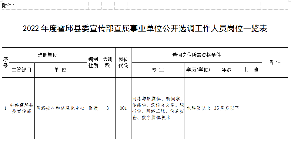 根据县委编委批准的用编指标,纳入本次公开选调的选调计划3名,详见《2022年度霍邱县委宣传部直属事业单位公开选调工作人员岗位情况一览表》(以下简称《一览表》)。