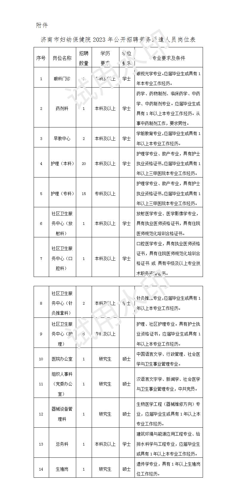 详见附件《济南市妇幼保健院2023年公开招聘劳务派遣人员岗位表》