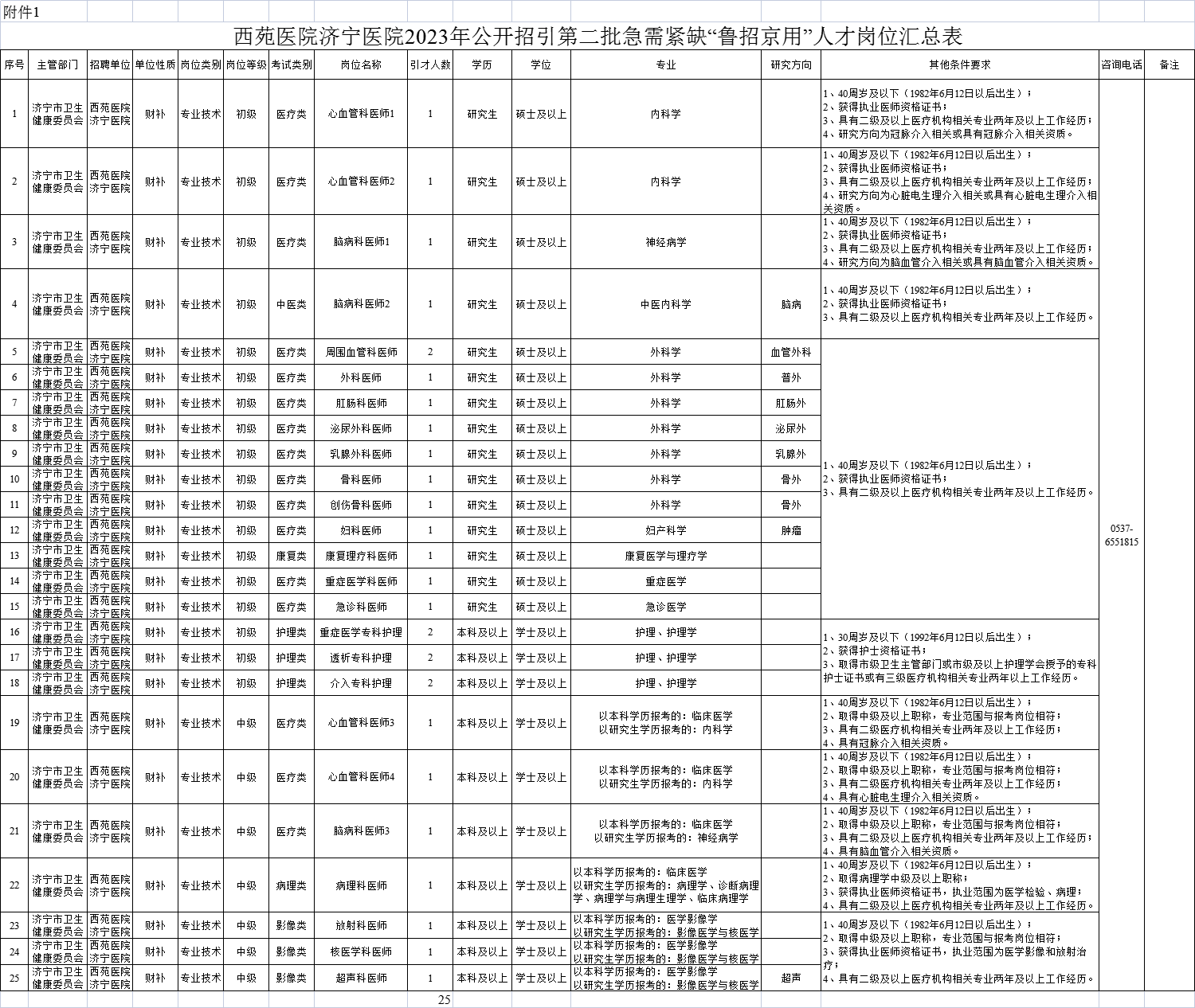 招聘岗位及具体要求详见《西苑医院济宁医院2023年公开招引第二批急需紧缺“鲁招京用”人才岗位汇总表》(附件1)。