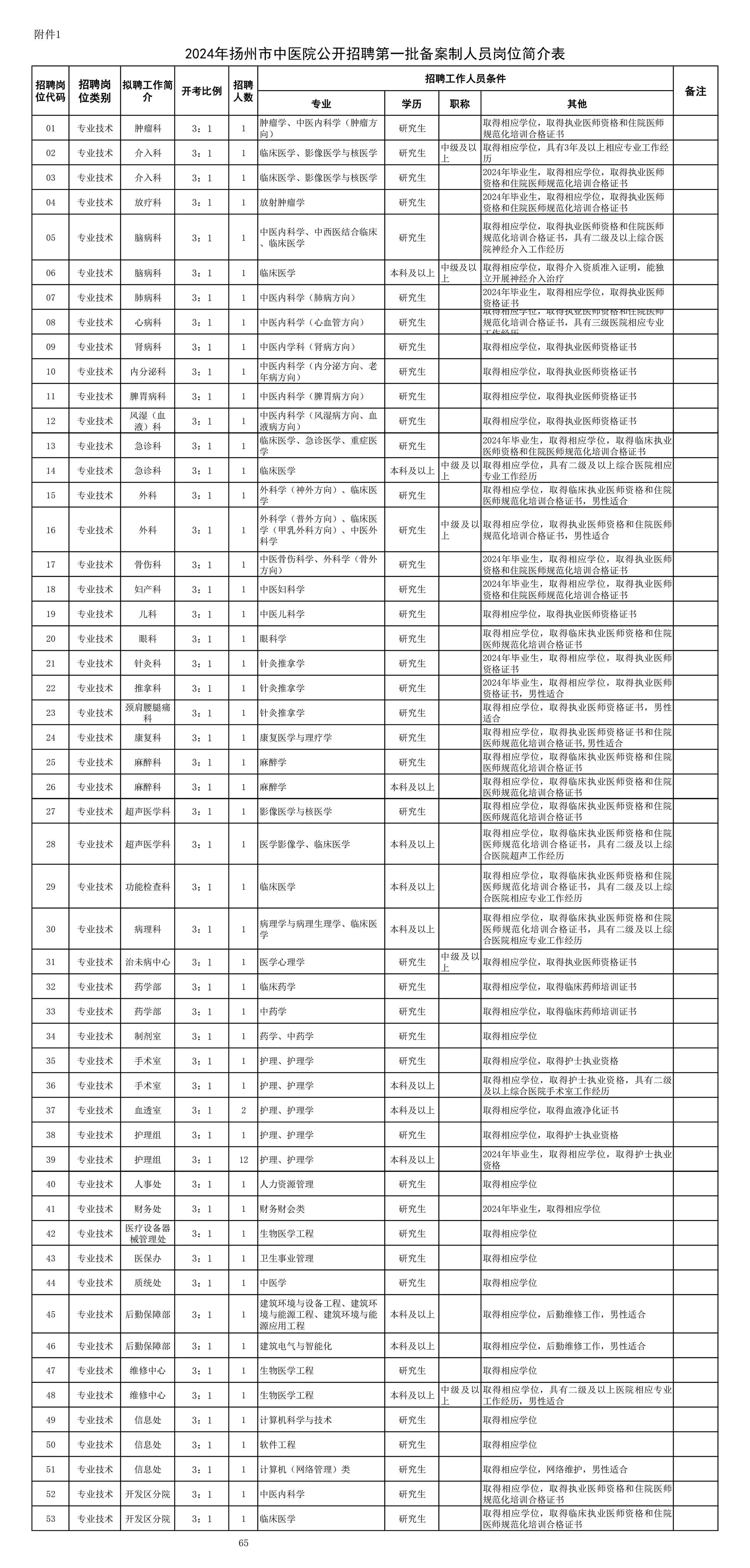 附件1:2024年扬州市中医院公开招聘第一批备案制人员岗位简介表 附件2: 扬州市中医院备案制招聘报名表 扬州市中医院 2024年1月12日 以下附件请登录扬州市中医院官网(http://www.yzszyy.com/)“人力资源—招聘计划与动态”专栏下载。