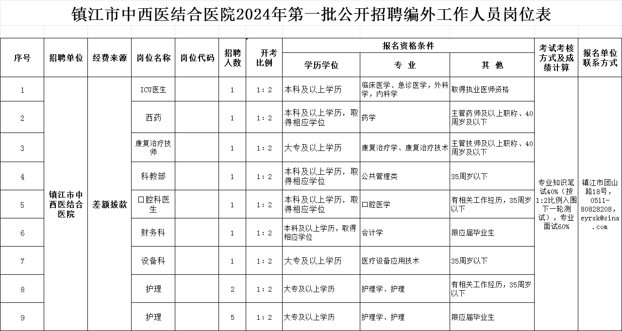 1.镇江市中西医结合医院2024年第一批招聘编外工作人员岗位表