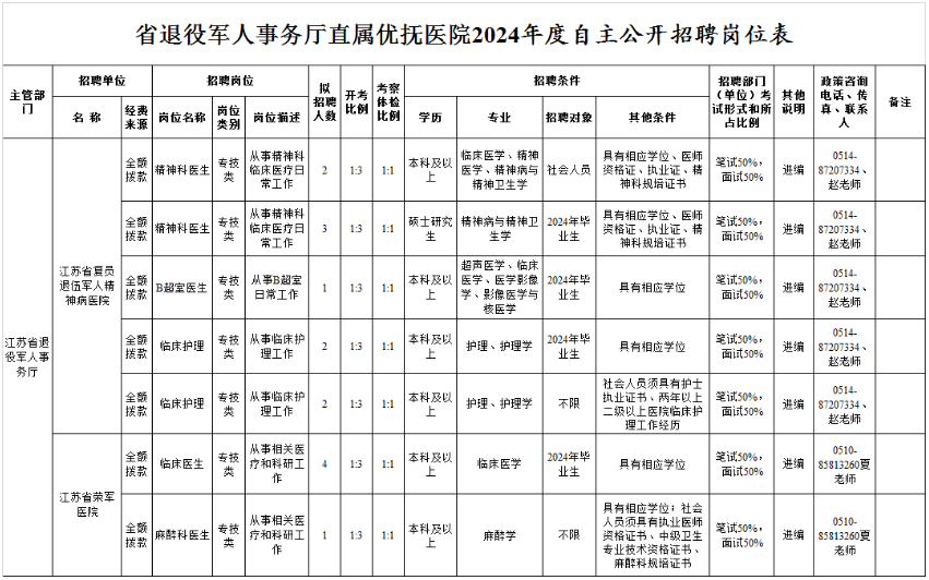 江苏省复员退伍军人精神病医院是江苏省退役军人事务厅直属的全额拨款事业单位,位于江苏省扬州市广陵区五台山路2号。江苏省荣军医院是江苏省退役军人事务厅直属的全额拨款事业单位,位于江苏省无锡市滨湖区惠河路196号。为更好地选拔优秀适岗人才,优化省属事业单位人员结构,现面向社会公开招聘优秀人才。根据《江苏省事业单位公开招聘人员办法》(苏办发〔2020〕9号)等规定,现将有关事项公告如下。