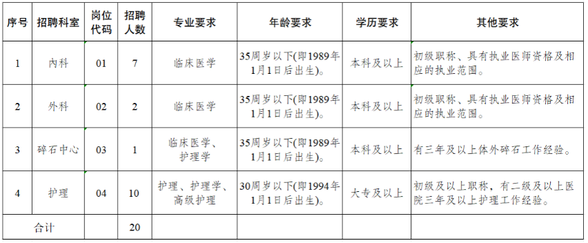 根据泗洪县第一人民医院工作需要,现面向社会公开招聘聘用制人员20人,详见《岗位简介表》(附件1)。