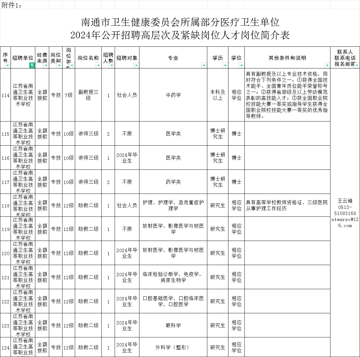 1.南通市卫生健康委员会所属部分医疗卫生单位2024年公开招聘高层次及紧缺岗位人才岗位简介表