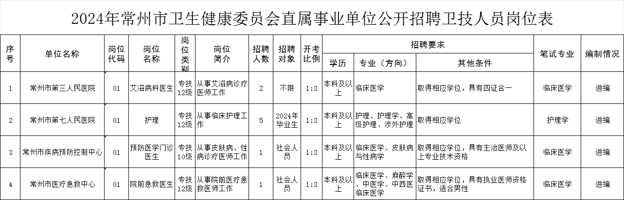 附件:2024年常州市卫生健康委员会直属事业单位公开招聘卫技人员岗位表