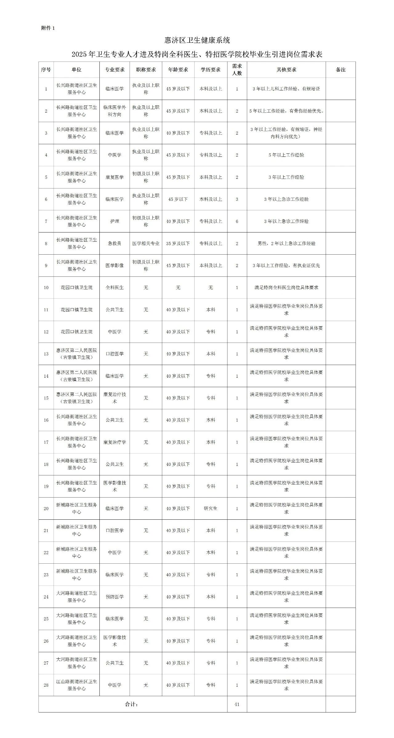 本次共计划引进卫生专业技术人员41名。(具体岗位明细见附件1)。