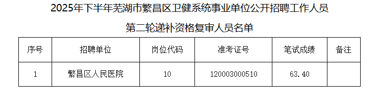 根据《2025年下半年芜湖市繁昌区卫健系统事业单位公开招聘工作人员公告》规定,经9月22日递补资格复审,部分岗位因个人放弃等原因出现入围人选缺额,按1:1的比例等额进行递补,现将第二轮递补资格复审和专业测试有关事项公告如下: