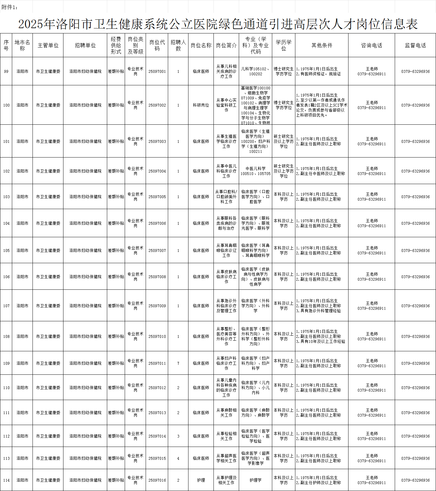 附件:1.2025年洛阳市妇幼保健院(河南省第二儿童医院、洛阳市儿童医院)绿色通道高层次人才引进岗位信息表