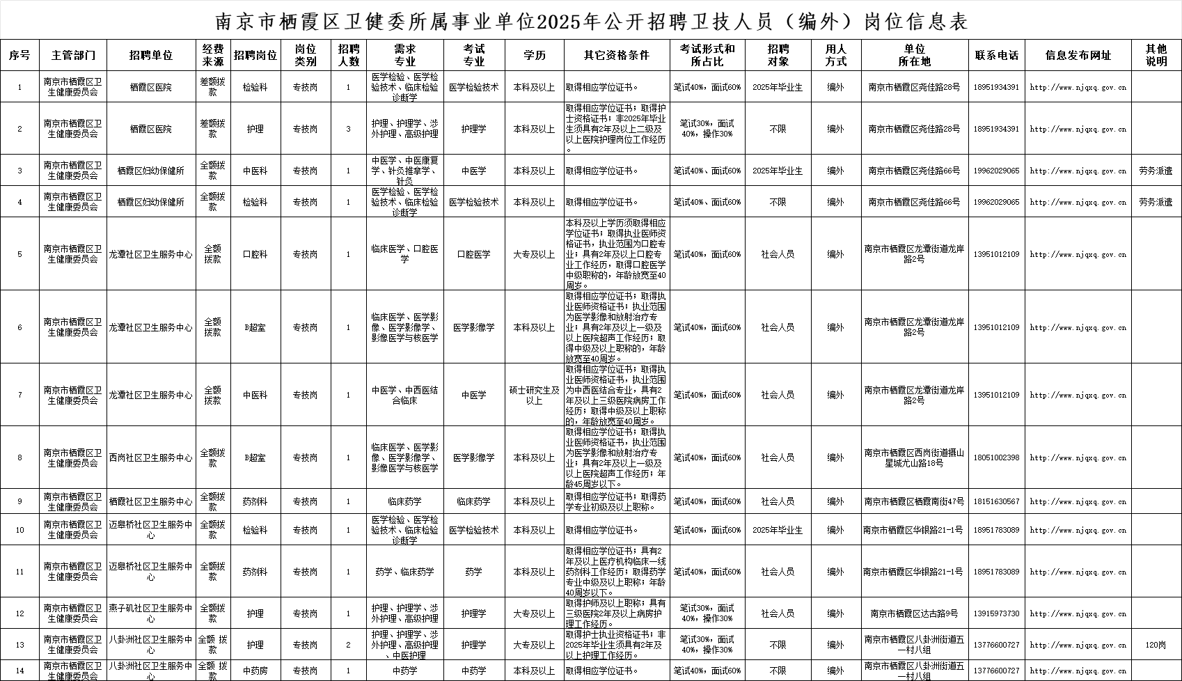 本次招聘相关信息在栖霞区人民政府网(http://www.njqxq.gov.cn)上发布。具体的招聘单位、岗位、数量、资格条件等详见《南京市栖霞区卫健委所属事业单位2025年公开招聘卫技人员岗位信息表》(附件,以下简称《岗位信息表》)。