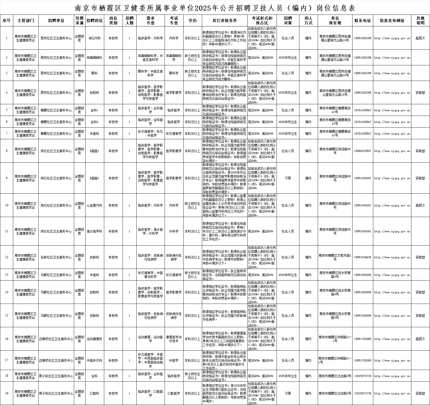 附件:南京市栖霞区卫健委所属事业单位2025年公开招聘卫技人员岗位信息表