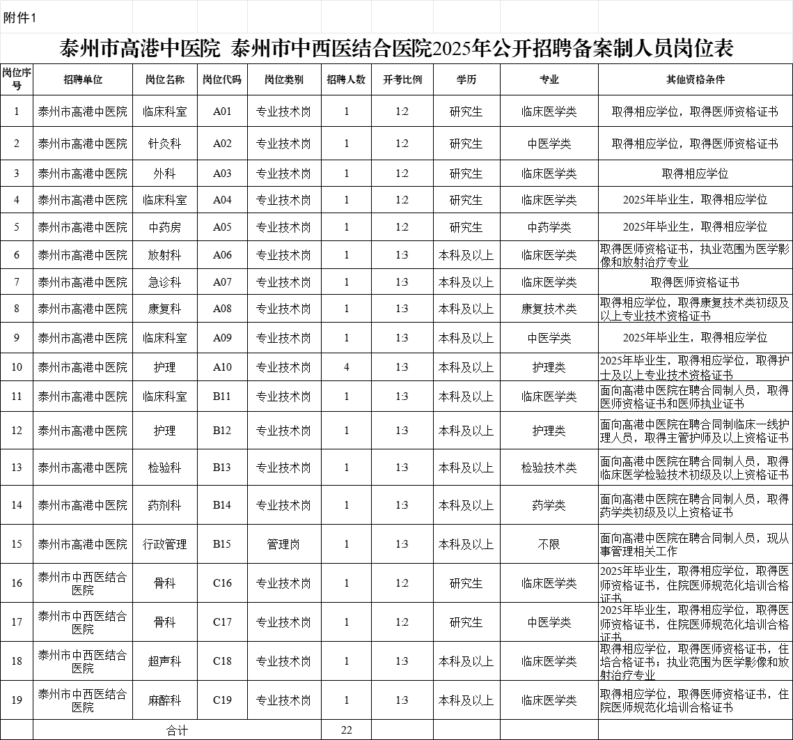 本次公开招聘备案制人员共22人。招聘岗位、专业、学历等要求详见《泰州市高港中医院、泰州市中西医结合医院2025年公开招聘备案制人员岗位表》(附件1,以下简称《岗位表》)。