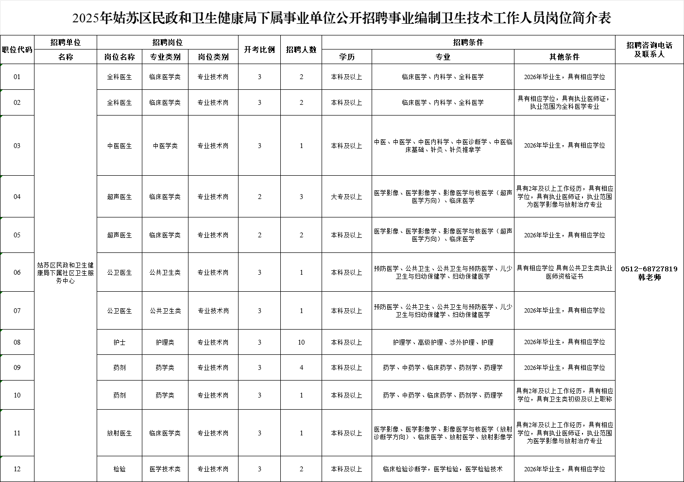 三、招聘岗位、人数及条件详见《2025年姑苏区民政和卫生健康局下属事业单位公开招聘事业编制卫生技术工作人员岗位简介表》(附件1)。可在苏州市人力资源和社会保障网(http://hrss.suzhou.gov.cn)、“中国姑苏”网站(http://www.gusu.gov.cn)上查询。