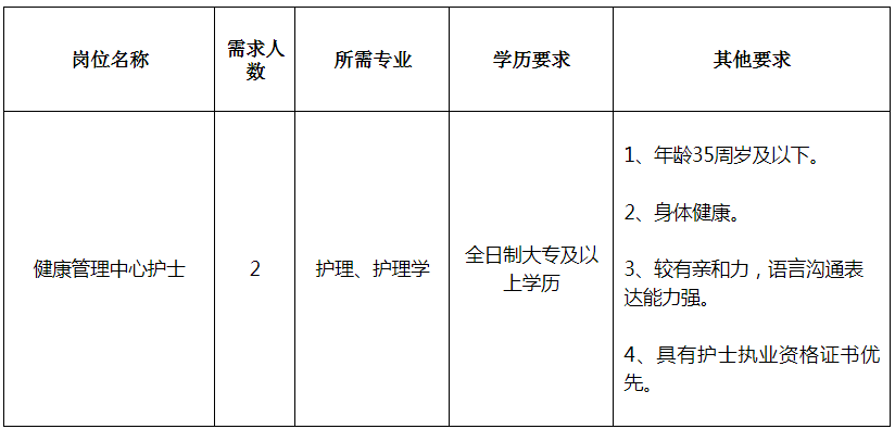 因工作需要,台州市中心医院(台州学院附属医院)拟面向社会公开招聘健康管理中心护士岗位2名,用工形式为第三方劳务派遣用工。现将有关事项公告如下:
