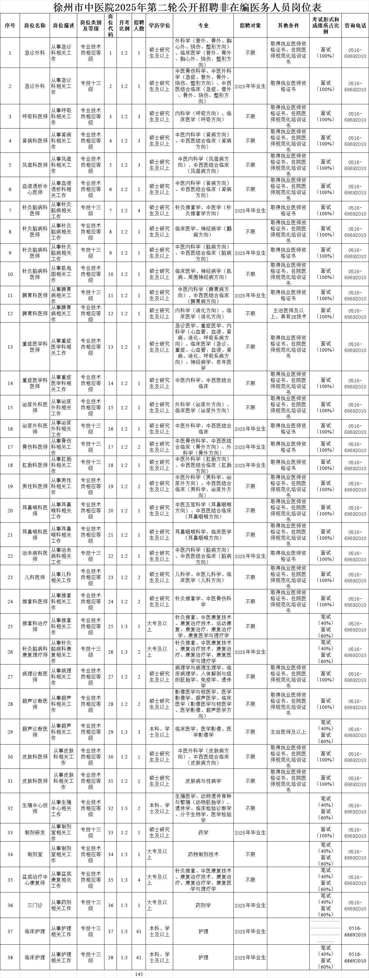 根据徐州市中医院发展及工作需要,经研究决定,现面向社会公开招聘非在编医务人员145名,现将有关事项公告如下:
