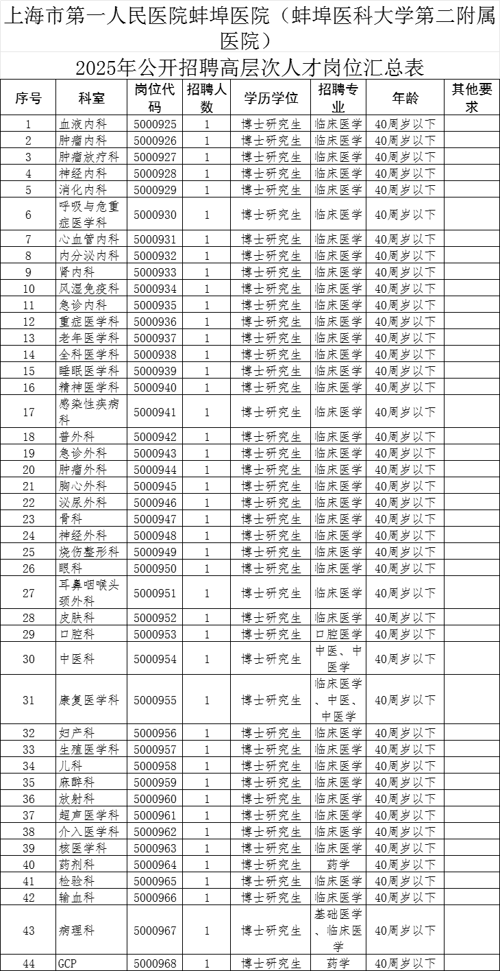 为做好2025年度上海市第一人民医院蚌埠医院(蚌埠医科大学第二附属医院)面向社会公开招聘高层次人才工作,根据《关于进一步做好事业单位公开招聘工作的通知》(人社部发〔2024〕57号)等相关规定,现就有关事项公告如下。