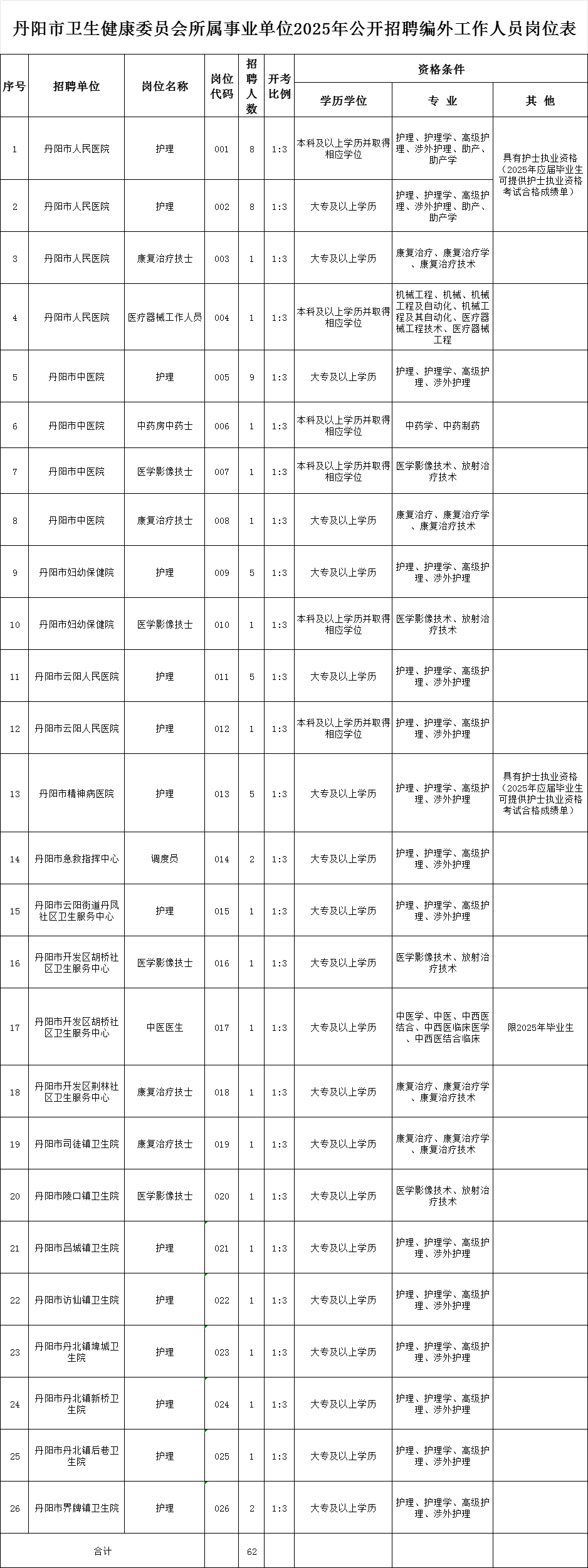 (三)招聘岗位、人数和所要求的学历(学位)、专业等资格条件详见《丹阳市卫生健康委员会所属事业单位2025年公开招聘编外工作人员岗位表》(附件1)(下简称《岗位表》),专业参考目录为《江苏省2025年度考试录用公务员专业参考目录》。