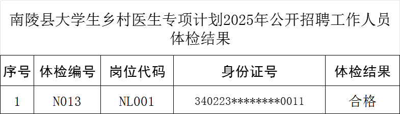 【体检公告】2025年南陵县大学生乡村医生专项计划公开招聘工作人员体检结果公布