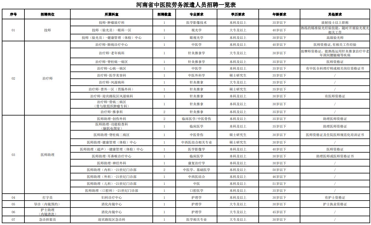 本次招聘具体的岗位、人数详见《河南省中医院劳务派遣人员招聘岗位一览表》(附件1)