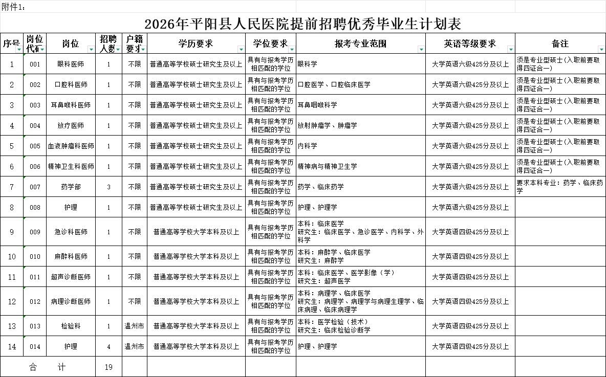 附件1:《2026年平阳县人民医院提前招聘优秀毕业生计划表》