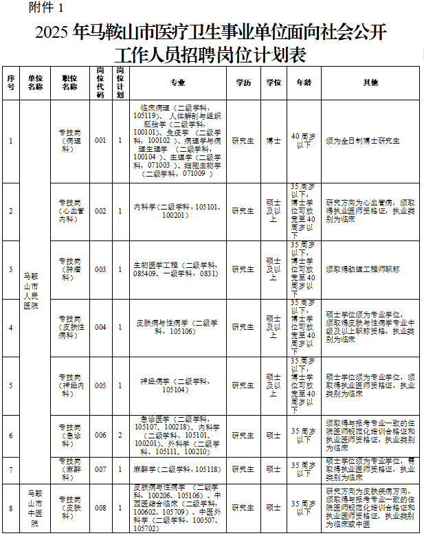 1.2025年马鞍山市医疗卫生事业单位面向社会公开招聘工作人员岗位计划表