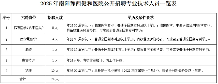 一 招聘计划及岗位具体要求 本次公开招聘专业技术人员24名,具体专业及岗位条件要求见附表。 二 招聘条件 1.基本条件 (1)热爱医疗卫生事业,志愿投身医院工作,遵纪守法,诚实守信,品行端正,无违法违纪行为,未受过党纪政纪处分; (2)具有良好的道德品行; (3)具备报考岗位所必需的基础理论和专业知识,符合相应的学历以及其他要求,聘用后能按要求及时到岗工作; (4)身体健康,能适应岗位工作条件; (5)年龄应符合各岗位要求:年龄要求在35周岁以内,应为1990年1月1日以后出生;年龄要求在30周岁以内,应为1995年1月1日以后出生; 2.有下列情形之一,不得参加应聘: (1)刑事处罚期限未满或者涉嫌违法犯罪正在接受调查的人员; (2)尚未解除党纪、政纪处分或正在接受纪律审查的人员; (3)曾在公开招聘考试中被认定有舞弊等严重违反招聘纪律行为人员; (4)国家和省等有关部门另有规定不得应聘的人员。 三 招聘程序 (一)发布信息 通过电视跑边、医院微信公众号等形式发布招聘公告。 (二)报名与资格审查 1.报名时间:2025年10月13日—2025年10月26日。 2.报名地点:南阳豫西健和医院门诊四楼人力资源部。 3.报名方式:现场报名。 4.应聘提交材料: (1)本人有效身份证、毕业证、学位证(本科及以上)、教育部电子注册备案表、资格证书等(原件、复印件各1份); (2)本人近期1寸正面免冠同底版彩照4张; (3)填写《人员基本情况登记表》。 5.资格审查 对符合条件人员进行备案登记、资格初审,由招聘办公室召开全体成员会议,对报考人员资格进行逐一复核确认,发布公告,公示参考人员名单,发放准考证,通知应聘人员参考。 资格审查贯穿整个招聘工作全过程。报名人员所提交材料如有弄虚作假者,一经发现随时取消其聘用资格。 (三)笔试 笔试成绩满分100分,占总成绩的50%。笔试主要测试应聘人员的综合素质,内容为拟招聘职位的基础理论和专业知识,不指定参考用书。 参考人员需持准考证、身份证方可入场参加考试。 (四)技能考核、面试 根据笔试成绩,按拟聘岗位1:3比例从高分到低分确定参加技能考核和面试人员(若最后一名出现成绩并列,可同时进入技能考核、面试)。 当拟聘岗位人数与笔试人数达不到1:3时,该岗位笔试人员全部进入技能考核和面试。 技能考核成绩满分100分,占总成绩的30%。技能考核主要考核应聘人员实际动手操作能力和专业技术掌握熟练程度。 面试成绩满分100分,占总成绩的20%。面试主要测试应聘人员的专业技能、语言表达、仪容仪表、沟通能力、团队意识等。 (五)考试总成绩 考试总成绩=笔试成绩×50%+技能考核×30%+面试成绩×20%。 (六)体检、考察 1.体检 根据考试总成绩,按聘用岗位1:1的比例确定参加体检和考察人员,体检标准参照《国家公务员录用体检通用标准(试行)》执行,统一组织实施。对因体检不合格者产生的空额,可按总成绩从高分到低分依次等额递补。 2.考察 考察的内容包括政治审查和报考资格复审。一是考察所具备的资格条件;二是考察是否有违法违纪行为等。考察过程中,因考察不合格出现招聘岗位缺额的不予递补,因自愿放弃出现招聘岗位缺额的,按考试总成绩从高分到低分依次等额递补。 (七)公示及聘用 对通过笔试、技能考核、面试、体检、考察的人员,按有关规定向社会进行公示。公示期满后,对没有问题或者反映问题不影响聘用的,医院和应聘人员按规定签订聘用合同。应聘人员按规定实行试用期制度,期满合格的正式聘用;不合格的,取消聘用资格。 报名者凡在规定的时间未参加笔试、技能考核、面试、体检、考察的,均视为自动放弃招聘资格。 本公告由医院公开招聘领导小组办公室负责解释,未尽事宜,以公告为准。 附:2025年南阳豫西健和医院公开招聘专业技术人员一览表 2025年10月13日