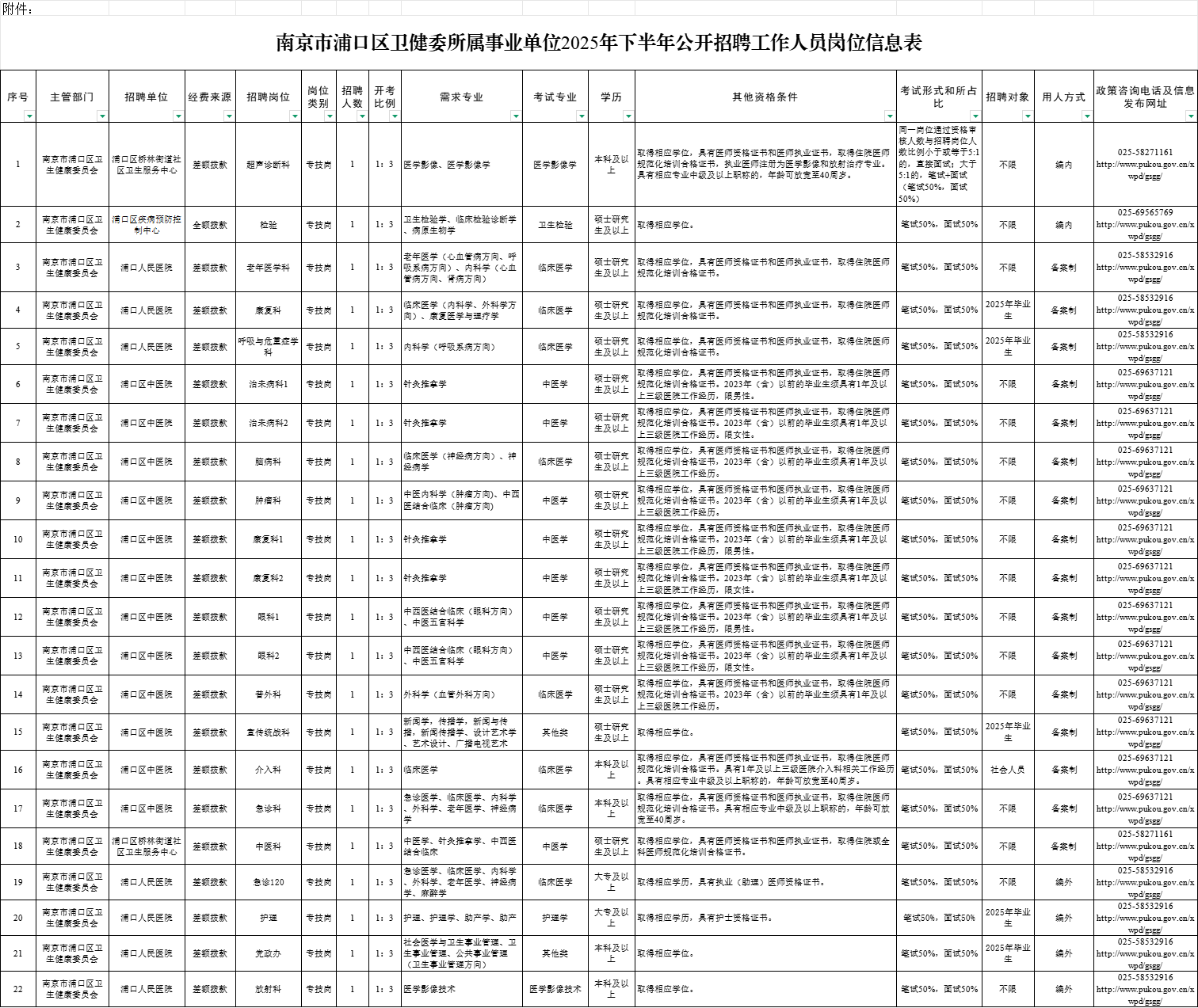有关招聘资格条件、咨询电话等信息详见《南京市浦口区卫健委所属事业单位2025年下半年公开招聘工作人员岗位信息表》(附件,以下简称《岗位信息表》)。