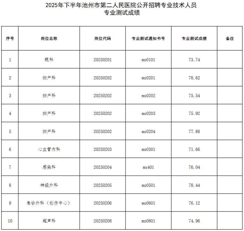 根据《2025年下半年池州市第二人民医院公开招聘专业技术人员公告》,现将各岗位考生专业测试成绩(见附件)予以公告。