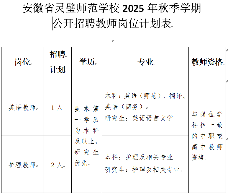 经2025年10月16日学校党委会议研究并报县委教育工委备案,计划招聘中职护理教师2名、英语教师1名,合计3名。具体见招聘岗位计划表。